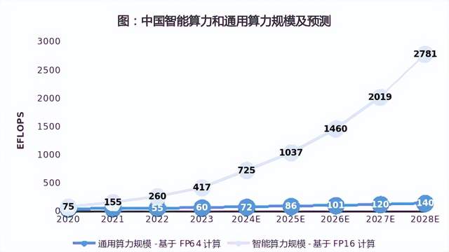 未来80%的场景都将基于人工智能,所占据的算力资源由智算中心提供[1]。预测显示,2023-2028年,中国通用算力和智能算力的五年年复合增长率将分别达到18.8%、46.2%。