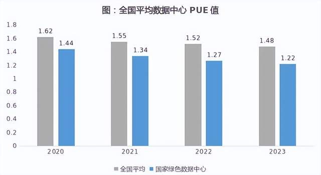 在国家大力推动绿色数据中心建设的背景下,我国数据中心的平均电能利用效率呈现逐步提升的趋势。PUE(电能利用效率,Power Usage Efficiency)是用来衡量数据中心用能效率的关键指标,代表数据中心消耗的所有能源与IT设备消耗的能源之比,PUE=1最为理想,意味着所有能耗都用于服务器设备运转,无其他能耗开销。近几年,全国数据中心的PUE值呈下降趋势,国家绿色数据中心的评级PUE值已降至1.22,有效发挥标杆引领作用。