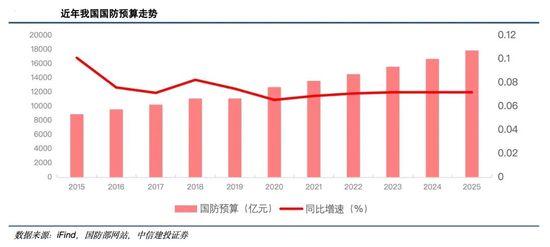 从需求特性看,军工行业具有一定逆周期性,需求端与宏观经济周期关联性较低。自2022年以来,我国军费预算增幅连续四年超过7%,中长期建军目标有望促使对国防建设的持续投入。