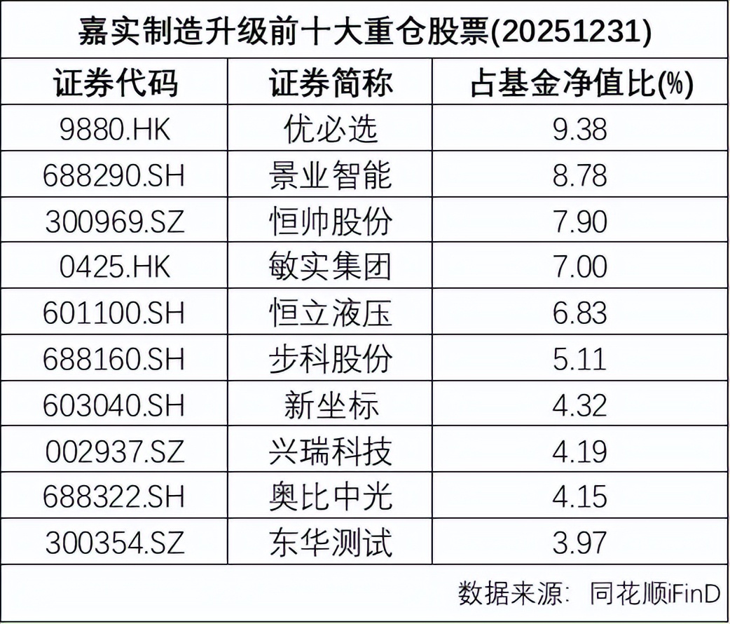 其二,也可以交给主动基金经理帮助我们精选核心环节与优质个股。嘉实制造升级股票型基金(A类018240/C类018241),聚焦挖掘受益于制造升级的投资机会,基金经理重点看好机器人相关领域。截至基金2025年四季报,近一年净值增长56.29%,同期业绩基准为28.67%,超额业绩印证选股实力。