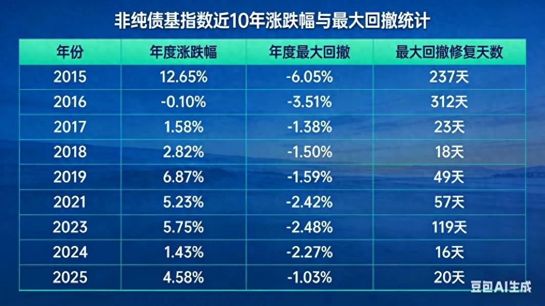 梳理该指数近10年最大回撤情况,我们发现,回撤修复时间与当年股市行情和市场环境波动直接相关,但无论牛熊考验,中长期还是呈现填坑上行趋势。具体到每只“固收+”产品,阶段回撤幅度和净值修复能力有所差异,是我们更要关注的指标,也能考察背后基金公司平台和基金经理投资实力。